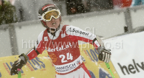 : Elisabeth Goergl of Austria reacts in finish of first run of last Women Giant slalom race of Audi FIS alpine skiing World Cup, which was held on Kandahar course in Garmisch-Partenkirchen, Germany. Last Giant slalom race of Women Audi FIS Alpine skiing World Cup 2009-10, was held on Thursday, 11th of March 2010 in Garmisch-Partenkirchen, Germany.
