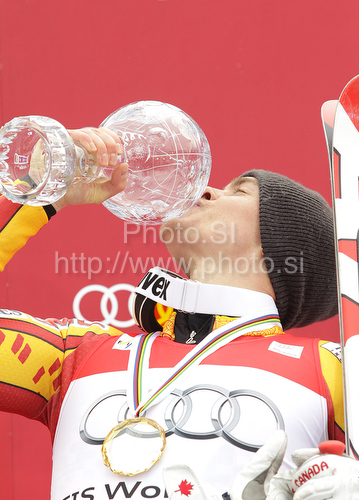 : Winner Erik Guay of Canada celebrates overall Super-G World cup victory after last Men Super-G race of Audi FIS alpine skiing World Cup, which was held on Kandahar course in Garmisch-Partenkirchen, Germany. Last Super-G race of Men Audi FIS Alpine skiing World Cup 2009-10, was held on Thursday, 11th of March 2010 in Garmisch-Partenkirchen, Germany.