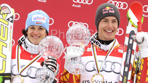: Overall super-g winner Erik Guay of Canada (R) and overall giant slalom winner Kathrin Hoelzl of Germany celebrates overall World cup victories after last Women Giant slalom and last men Super-G race of Audi FIS alpine skiing World Cup, which was held on Kandahar course in Garmisch-Partenkirchen, Germany. Last races of Women Audi FIS Alpine skiing World Cup 2009-10, were held on Thursday, 11th of March 2010 in Garmisch-Partenkirchen, Germany.