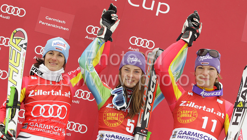 Garmisch-Partenkirchen ,Germany - 11.03.2010 : Winner Tina Maze of Slovenia (M), second placed Kathrin Hoelzl of Germany (L) and third placed Maria Riesch of Germany (R) celebrate their medals won in last Women Giant slalom race of Audi FIS alpine skiing World Cup, which was held on Kandahar course in Garmisch-Partenkirchen, Germany. Last Giant slalom race of Women Audi FIS Alpine skiing World Cup 2009-10, was held on Thursday, 11th of March 2010 in Garmisch-Partenkirchen, Germany. Photo by: Leena Jeroncic