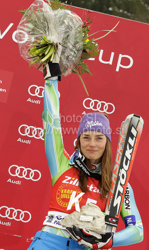 : Winner Tina Maze of Slovenia celebrates her medal won in last Women Giant slalom race of Audi FIS alpine skiing World Cup, which was held on Kandahar course in Garmisch-Partenkirchen, Germany. Last Giant slalom race of Women Audi FIS Alpine skiing World Cup 2009-10, was held on Thursday, 11th of March 2010 in Garmisch-Partenkirchen, Germany.
