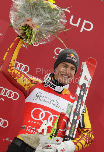 : Winner Erik Guay of Canada celebrates his medal won in last Men Super-G race of Audi FIS alpine skiing World Cup, which was held on Kandahar course in Garmisch-Partenkirchen, Germany. Last Super-G race of Men Audi FIS Alpine skiing World Cup 2009-10, was held on Thursday, 11th of March 2010 in Garmisch-Partenkirchen, Germany.