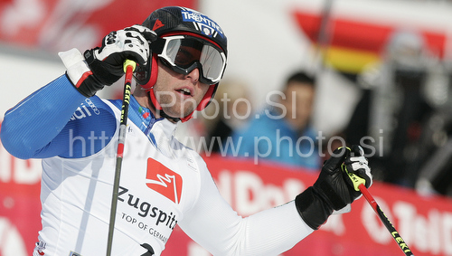 : Second placed Davide Simoncelli of Italy reacts in finish of second run of last Men Giant slalom race of Audi FIS alpine skiing World Cup, which was held on Kandahar course in Garmisch-Partenkirchen, Germany. Last Giant slalom race of Men Audi FIS Alpine skiing World Cup 2009-10, was held on Friday, 12th of March 2010 in Garmisch-Partenkirchen, Germany.