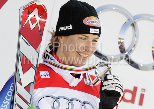 Garmisch-Partenkirchen ,Germany - 12.03.2010 : Third placed Nadia Styger of Switzerland celebrates overall Super-G World cup medal after last Women Super-G race of Audi FIS alpine skiing World Cup, which was held on Kandahar course in Garmisch-Partenkirchen, Germany. Last super-g race of Women Audi FIS Alpine skiing World Cup 2009-10, was held on Friday, 12th of March 2010 in Garmisch-Partenkirchen, Germany. Photo by: Leena Jeroncic
