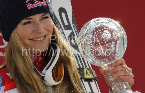 : Winner Lindsey Vonn of USA celebrates overall Super-G World cup victory after last Women Super-G race of Audi FIS alpine skiing World Cup, which was held on Kandahar course in Garmisch-Partenkirchen, Germany. Last super-g race of Women Audi FIS Alpine skiing World Cup 2009-10, was held on Friday, 12th of March 2010 in Garmisch-Partenkirchen, Germany.