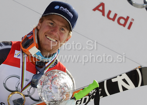 : Winner Ted Ligety of USA celebrates overall Giant slalom World cup victory after last Men giant slalom race of Audi FIS alpine skiing World Cup, which was held on Kandahar course in Garmisch-Partenkirchen, Germany. Last giant slalom race of Men Audi FIS Alpine skiing World Cup 2009-10, was held on Friday, 12th of March 2010 in Garmisch-Partenkirchen, Germany.