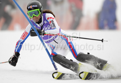: Sandrine Aubert of France skiing in first run of last Women slalom race of Audi FIS alpine skiing World Cup, which was held on Gudiberg course in Garmisch-Partenkirchen, Germany. Last slalom race of Women Audi FIS Alpine skiing World Cup 2009-10, was held on Saturday, 13th of March 2010 in Garmisch-Partenkirchen, Germany.