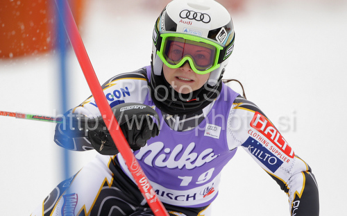 : Sanni Leinonen of Finland skiing in first run of last Women slalom race of Audi FIS alpine skiing World Cup, which was held on Gudiberg course in Garmisch-Partenkirchen, Germany. Last slalom race of Women Audi FIS Alpine skiing World Cup 2009-10, was held on Saturday, 13th of March 2010 in Garmisch-Partenkirchen, Germany.