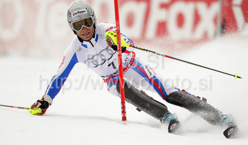 : Julien Lizeroux of France skiing in first run of last Men slalom race of Audi FIS alpine skiing World Cup, which was held on Gudiberg course in Garmisch-Partenkirchen, Germany. Last slalom race of Men Audi FIS Alpine skiing World Cup 2009-10, was held on Saturday, 13th of March 2010 in Garmisch-Partenkirchen, Germany.