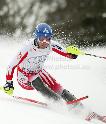 : Benjamin Raich of Austria skiing in second run of last Men slalom race of Audi FIS alpine skiing World Cup, which was held on Gudiberg course in Garmisch-Partenkirchen, Germany. Last slalom race of Men Audi FIS Alpine skiing World Cup 2009-10, was held on Saturday, 13th of March 2010 in Garmisch-Partenkirchen, Germany.