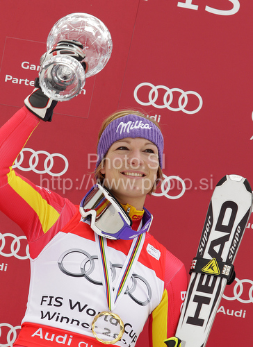 Garmisch-Partenkirchen ,Germany - 13.03.2010 : Winner Maria Riesch of Germany celebrates overall slalom World cup victory after last Women slalom race of Audi FIS alpine skiing World Cup, which was held on Gudiberg course in Garmisch-Partenkirchen, Germany. Last slalom race of Women Audi FIS Alpine skiing World Cup 2009-10, was held on Saturday, 13th of March 2010 in Garmisch-Partenkirchen, Germany. Photo by: Primoz Jeroncic