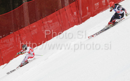 : Elisabeth Goergl of Austria (L) and Ana Jelusic of Croatia (R) skiing in team race of Audi FIS alpine skiing World Cup, which was held on Kandahar course in Garmisch-Partenkirchen, Germany. Team race of Audi FIS Alpine skiing World Cup 2009-10, was held on Sunday, 14th of March 2010 in Garmisch-Partenkirchen, Germany.