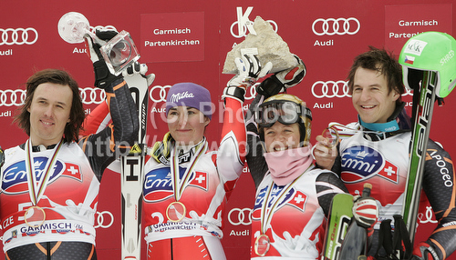 Garmisch-Partenkirchen ,Germany - 14.03.2010 : Czech team with Ondrej Bank, Sarka Zahrobska, Lucie Hrstkova and Krystof Kryzl (from L to R) celebrate medal won in team race of Audi FIS alpine skiing World Cup, which was held on Kandahar course in Garmisch-Partenkirchen, Germany. Team race of Audi FIS Alpine skiing World Cup 2009-10, was held on Sunday, 14th of March 2010 in Garmisch-Partenkirchen, Germany. Photo by: Leena Jeroncic