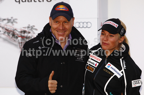 Soelden ,Austria - 21.10.2010 : Didier Cuche (L) and Lara Gut (R) of Switzerland during Audi Media talk event in Soelden, Austria. Audi Media talk event was held on Thursday, 21st of October 2010 in Soelden, Austria, before start of Audi FIS Alpine skiing World cup 2010-2011, which will start with women giant slalom race on Saturday, 23rd of October 2010, and will be followed by men giant slalom race day later on Rettenbach glacier above Soelden, Austria. Photo by: Primoz Jeroncic