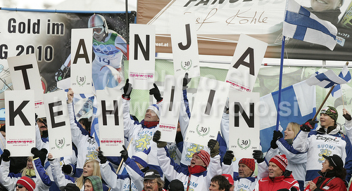 : Finnish fans in finish of first run of Women giant slalom race of Audi FIS alpine skiing World Cup in Soelden, Austria. First giant slalom race of Women Audi FIS Alpine skiing World Cup 2010-11, was held on Saturday, 23rd of October 2010, on Rettenbach glacier above Soelden, Austria.