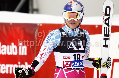 : Lindsey Vonn of USA reacts in finish of second run of Women giant slalom race of Audi FIS alpine skiing World Cup in Soelden, Austria. First giant slalom race of Women Audi FIS Alpine skiing World Cup 2010-11, was held on Saturday, 23rd of October 2010, on Rettenbach glacier above Soelden, Austria.
