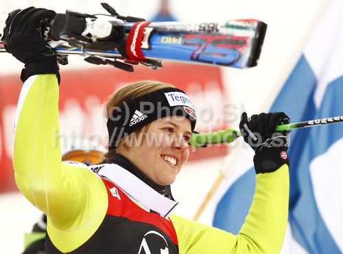 : Winner Viktoria Rebensburg of Germany celebrates her medal won in Women giant slalom race of Audi FIS alpine skiing World Cup in Soelden, Austria. First giant slalom race of Women Audi FIS Alpine skiing World Cup 2010-11, was held on Saturday, 23rd of October 2010, on Rettenbach glacier above Soelden, Austria.