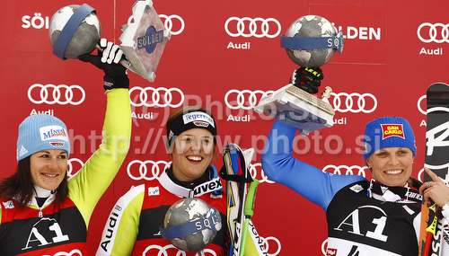 : Winner Viktoria Rebensburg of Germany (M), second placed Kathrin Hoelzl of Germany (L) and third placed Manuela Moelgg of Italy (R) celebrate their medals won in Women giant slalom race of Audi FIS alpine skiing World Cup in Soelden, Austria. First giant slalom race of Women Audi FIS Alpine skiing World Cup 2010-11, was held on Saturday, 23rd of October 2010, on Rettenbach glacier above Soelden, Austria.