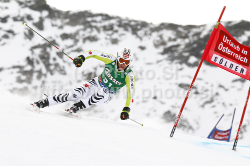 : Fritz Dopfer of Germany skiing in first run of Men giant slalom race of Audi FIS alpine skiing World Cup in Soelden, Austria. First giant slalom race of Men Audi FIS Alpine skiing World Cup 2010-11, was held on Sunday, 24th of October 2010, on Rettenbach glacier above Soelden, Austria.