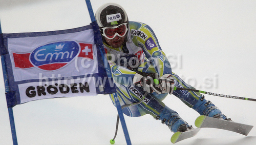 : Gasper Markic of Slovenia skiing in Men Super-G race of Audi FIS alpine skiing World Cup in Val Gardena, Italy. Super-G race of Men Audi FIS Alpine skiing World Cup 2010-11, was held on Friday, 17th of December 2010, on Saslong course in Val Gardena, Italy.