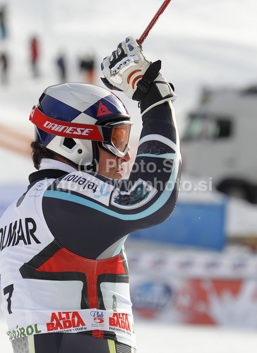 : Aksel Lund Svindal of Norway reacts in finish of second run of Men giant slalom race of Audi FIS alpine skiing World Cup in Alta Badia, Italy. Giant slalom race of Men Audi FIS Alpine skiing World Cup 2010-11, was held on Sunday, 20th of December 2010, on Gran Risa course in Alta Badia, Italy.