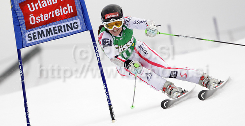 : Elisabeth Goergl of Austria skiing in first run of Women giant slalom race of Audi FIS alpine skiing World Cup in Semmering, Austria. Giant slalom race of Women Audi FIS Alpine skiing World Cup 2010-11, was held on Tuesday, 28th of December 2010, in Semmering, Austria.