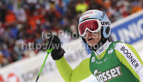 : Third placed Kathrin Hoelzl of Germany reacts in finish of second run of Women giant slalom race of Audi FIS alpine skiing World Cup in Semmering, Austria. Giant slalom race of Women Audi FIS Alpine skiing World Cup 2010-11, was held on Tuesday, 28th of December 2010, in Semmering, Austria.