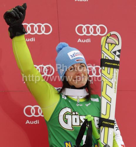: Third placed Kathrin Hoelzl of Germany celebrates her medal won in Women giant slalom race of Audi FIS alpine skiing World Cup in Semmering, Austria. Giant slalom race of Women Audi FIS Alpine skiing World Cup 2010-11, was held on Tuesday, 28th of December 2010, in Semmering, Austria.