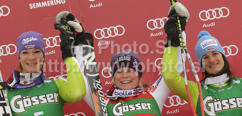 : Winner Tessa Worley of France (M), second placed Maria Riesch of Germany (L) and third placed Kathrin Hoelzl of Germany (R) celebrate their medals won in Women giant slalom race of Audi FIS alpine skiing World Cup in Semmering, Austria. Giant slalom race of Women Audi FIS Alpine skiing World Cup 2010-11, was held on Tuesday, 28th of December 2010, in Semmering, Austria.