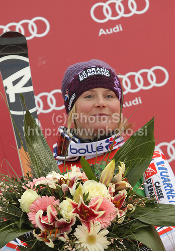: Winner Tessa Worley of France celebrates her medal won in Women giant slalom race of Audi FIS alpine skiing World Cup in Semmering, Austria. Giant slalom race of Women Audi FIS Alpine skiing World Cup 2010-11, was held on Tuesday, 28th of December 2010, in Semmering, Austria.