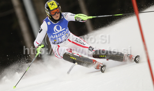 : Nicole Hosp of Austria skiing in first run of Women slalom race of Audi FIS alpine skiing World Cup in Semmering, Austria. Slalom race of Women Audi FIS Alpine skiing World Cup 2010-11, was held on Wednesday, 29th of December 2010, in Semmering, Austria.