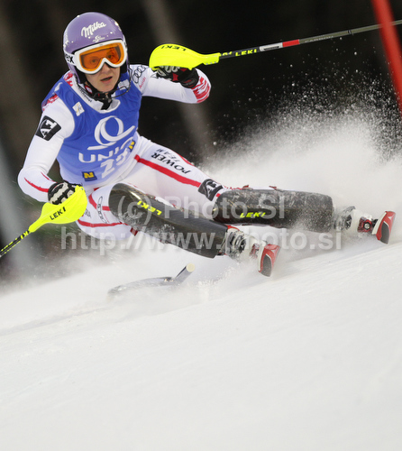 : Michaela Kirchgasser of Austria skiing in first run of Women slalom race of Audi FIS alpine skiing World Cup in Semmering, Austria. Slalom race of Women Audi FIS Alpine skiing World Cup 2010-11, was held on Wednesday, 29th of December 2010, in Semmering, Austria.