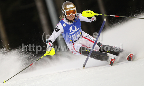 : Bernadette Schild of Austria skiing in first run of Women slalom race of Audi FIS alpine skiing World Cup in Semmering, Austria. Slalom race of Women Audi FIS Alpine skiing World Cup 2010-11, was held on Wednesday, 29th of December 2010, in Semmering, Austria.