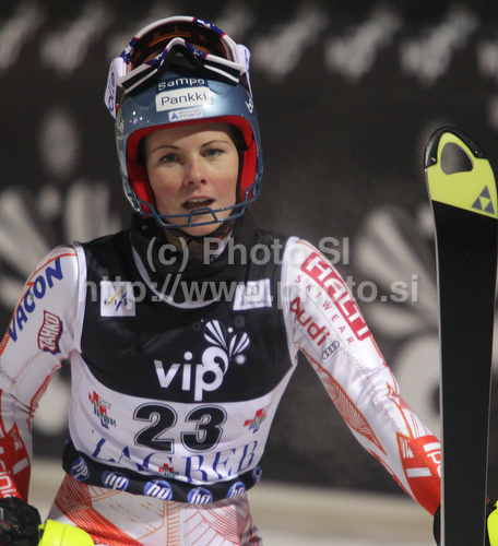 : Sanni Leinonen of Finland reacts in finish of second run of Women slalom race of Audi FIS alpine skiing World Cup in Zagreb, Croatia. Slalom race of Women Audi FIS Alpine skiing World Cup 2010-11, was held on Tuesday, 4th of January 2011, in Sljeme above Zagreb, Croatia.