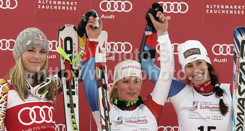 : From L to R: second placed Lindsey Vonn of USA, winner Lara Gut of Switzerland and third placed Dominique Gisin of Switzerland at the flower ceremony of the Women Super G race of FIS Audi Alpine World cup Altenmarkt-Zauchensee in Zauchensee, Austria. Super G race of FIS Audi Alpine World cup in season 2010 / 2011 was held on Sunday, 9th of January 2011 on Kaelberloch race track at Zauchensee, Austria.