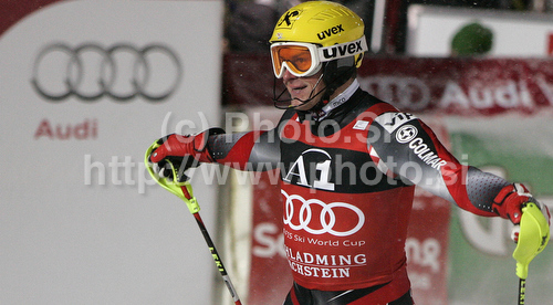 : Fifth placed Ivica Kostelic of Croatia reacts in finish of second run of Men slalom race of Audi FIS alpine skiing World Cup in Schladming, Austria. Traditional Night slalom race of Men Audi FIS Alpine skiing World Cup 2010-11, was held on Tuesday, 25th of January 2011, in Schladming, Austria.