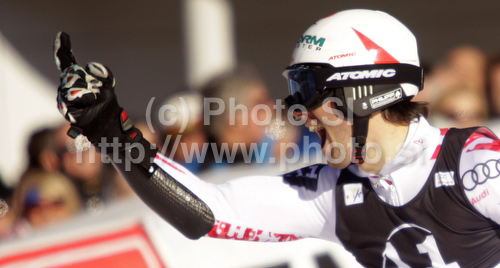 : Winner Philipp Schoerghofer of Austria reacts in finish of second run of Men Giant slalom race of Audi FIS alpine skiing World Cup in Hinterstoder, Austria. Giant slalom race of Men Audi FIS Alpine skiing World Cup 2010-11, was held on Sunday, 6th of February 2011, in Hinterstoder, Austria.
