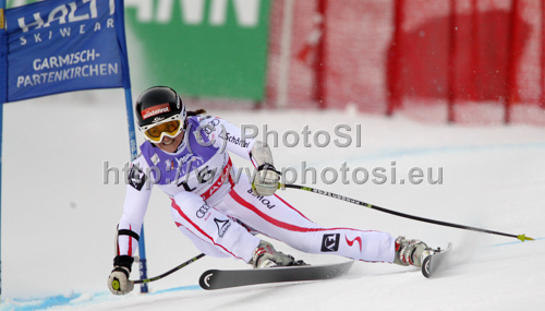 : Winner Elisabeth Goergl of Austria skiing in Women Super-G race of FIS alpine skiing World Championships in Garmisch-Partenkirchen, Germany. Super-G race of Women Super-G race of FIS alpine skiing World Championships, was held on Tuesday, 8th of February 2011, in Garmisch-Partenkirchen, Germany.