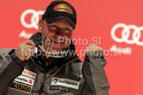 : Second placed Didier Cuche of Switzerland celebrates his medal won in Men downhill race of FIS alpine skiing World Championships in Garmisch-Partenkirchen, Germany. Men downhill race of FIS alpine skiing World Championships, was held on Saturday, 12th of February 2011, in Garmisch-Partenkirchen, Germany.