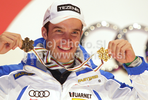 Garmisch-Partenkirchen ,Germany - 12.02.2011 : Third placed Christof Innerhofer of Italy celebrates his medal won in Men downhill race of FIS alpine skiing World Championships in Garmisch-Partenkirchen, Germany. Men downhill race of FIS alpine skiing World Championships, was held on Saturday, 12th of February 2011, in Garmisch-Partenkirchen, Germany. Photo by: Mitja Smid Bricelj