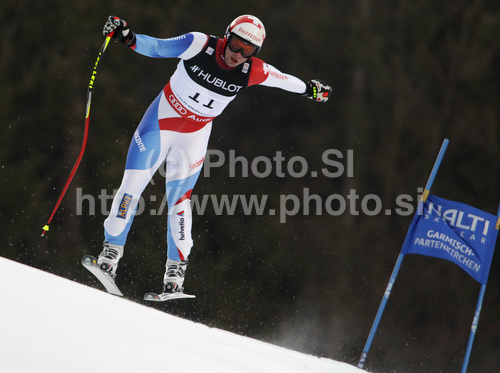 : Beat Feuz of Switzerland skiing in downhill of men super combined race of FIS alpine skiing World Championships in Garmisch-Partenkirchen, Germany. Men super combined race of FIS alpine skiing World Championships, was held on Monday, 14th of February 2011, in Garmisch-Partenkirchen, Germany.