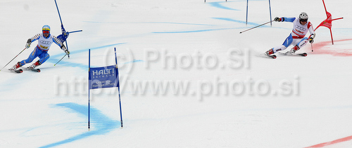 : Matts Olsson of Sweden and Marc Berthod of Switzerland skiing in team race of FIS alpine skiing World Championships in Garmisch-Partenkirchen, Germany. Team race of FIS alpine skiing World Championships, was held on Wednesday, 16th of February 2011, in Garmisch-Partenkirchen, Germany.