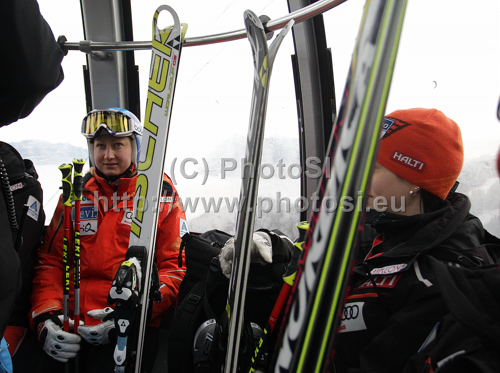 : Tanja Poutiainen of Finland riding with gondola to start of Women giant slalom race of FIS alpine skiing World Championships in Garmisch-Partenkirchen, Germany. Women giant slalom race of FIS alpine skiing World Championships, was held on Thursday, 17th of February 2011, in Garmisch-Partenkirchen, Germany.