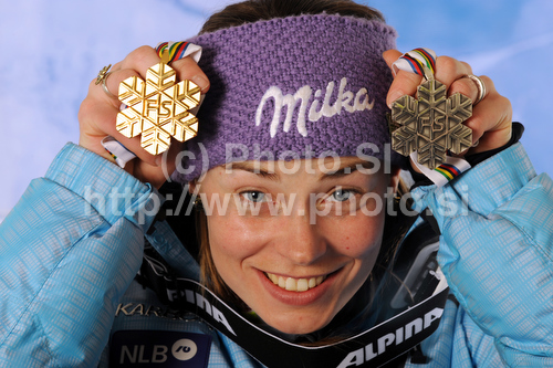 Garmisch-Partenkirchen ,Germany - 17.02.2011 : Winner Tina Maze of Slovenia celebrates her medal won in Women giant slalom race of FIS alpine skiing World Championships in Garmisch-Partenkirchen, Germany. Women giant slalom race of FIS alpine skiing World Championships, was held on Thursday, 17th of February 2011, in Garmisch-Partenkirchen, Germany. Photo by: Pool/PhotoSI