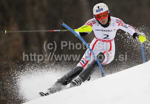: Nastasia Noens of France skiing in first run of Women slalom race of FIS alpine skiing World Championships in Garmisch-Partenkirchen, Germany. Women slalom race of FIS alpine skiing World Championships, was held on Saturday, 19th of February 2011, in Garmisch-Partenkirchen, Germany.