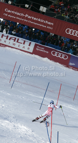 : Winner Marlies Schild of Austria skiing in second run of Women slalom race of FIS alpine skiing World Championships in Garmisch-Partenkirchen, Germany. Women slalom race of FIS alpine skiing World Championships, was held on Saturday, 19th of February 2011, in Garmisch-Partenkirchen, Germany.