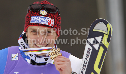 Garmisch-Partenkirchen ,Germany - 20.02.2011 : Third placed Manfred Moelgg of Italy celebrates his medal won in Men slalom race of FIS alpine skiing World Championships in Garmisch-Partenkirchen, Germany. Men slalom race of FIS alpine skiing World Championships, was held on Sunday, 20th of February 2011, in Garmisch-Partenkirchen, Germany. Photo by: Mitja Smid Bricelj
