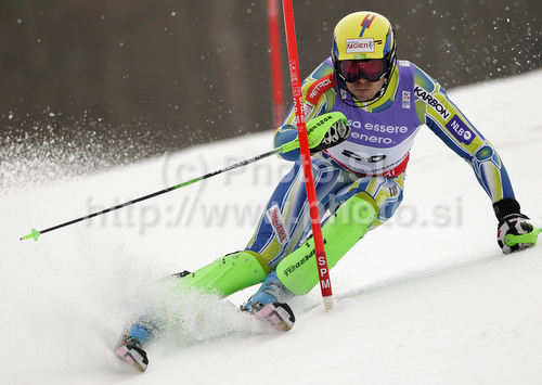 : Mitja Valencic of Slovenia skiing in first run of Men slalom race of FIS alpine skiing World Championships in Garmisch-Partenkirchen, Germany. Men slalom race of FIS alpine skiing World Championships, was held on Sunday, 20th of February 2011, in Garmisch-Partenkirchen, Germany.