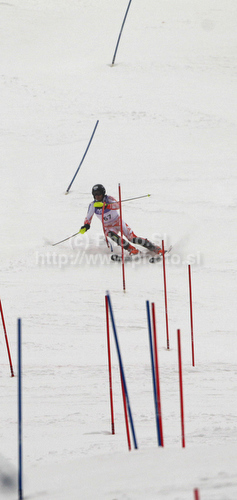 : Santeri Paloniemi of Finland skiing in first run of Men slalom race of FIS alpine skiing World Championships in Garmisch-Partenkirchen, Germany. Men slalom race of FIS alpine skiing World Championships, was held on Sunday, 20th of February 2011, in Garmisch-Partenkirchen, Germany.