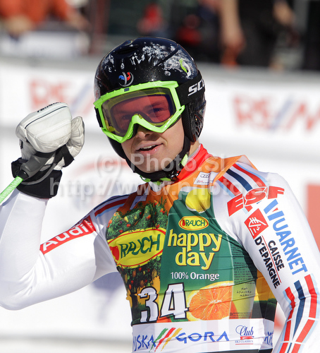 : Second placed Alexis Pinturault of France reacts in finish of second run of Men giant slalom race of Audi FIS alpine skiing World Cup 2010-2011 in Kranjska Gora, Slovenia. Men giant slalom race of FIS alpine skiing World Championships, was held on Saturday, 5th of March 2011, in Kranjska Gora, Slovenia.